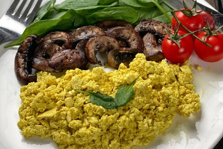A tofu scramble is an important addition to a breakfast burrito or our best bistro-style breakfast too!